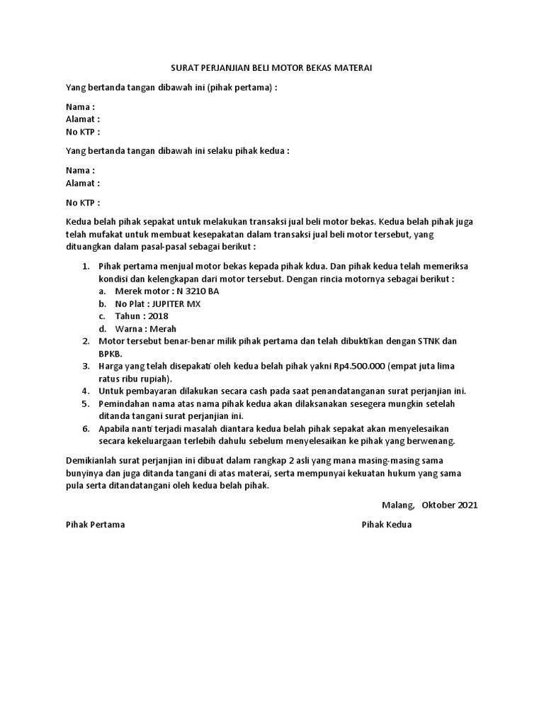 Surat Perjanjian Jual Beli Motor Bermaterai Pdf